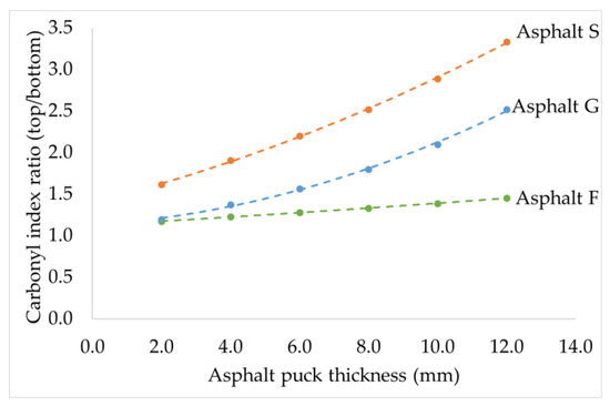 Regardless of the puck thickness, asphalt S always presented a higher CI ratio than that of asphalt G, which was greater than that of asphalt F. These differences in CI ratios between the three asphalts could be related to their chemistry, but also to some physical parameters, such as viscosity. This last factor could play a key role in the diffusion of oxygen in asphalt.