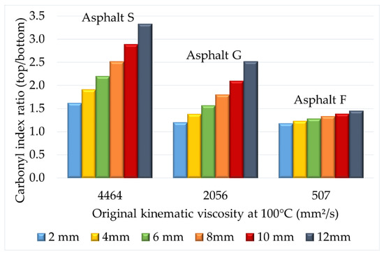 From this figure, it was observed that the greater the kinematic viscosity at 100 °C, the larger the CI ratio was, regardless of the sample thickness. This graph confirmed that the original kinematic viscosity of the tested asphalt influenced oxygen diffusion into the sample. This indicated that oxygen could diffuse more easily into the entire asphalt matrix when the kinematic viscosity was low.