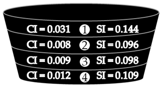 To evaluate how oxidized compounds (carbonyl and sulfoxide functional groups) were distributed through the whole asphalt puck after PAV aging, Protocol 4 was conducted, as described in Figure 2. An 11 mm puck made with asphalt G was cut into four equal parts after PAV aging. Each layer was analyzed by infrared spectroscopy. On each layer, CI and SI values were calculated. The results are summarized in Figure 10.