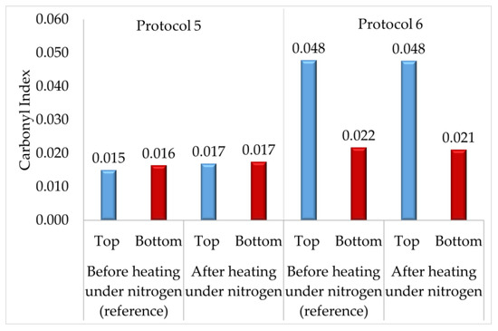The results of Protocol 5 (Figure 11) showed that the CI calculated at the top and bottom of samples heated or not heated under a nitrogen atmosphere were the same. This absence of an increase in CI at the bottom during these conditions suggested that the sedimentation phenomenon involving oxidized compounds was absent in semiliquid asphalt. Thus, Hypothesis 1 was not confirmed.