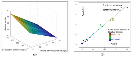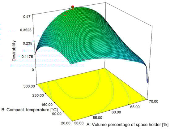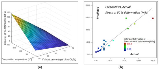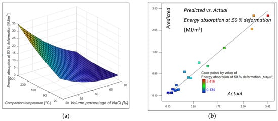 - By optimizing the processing parameters within the Design Expert 8 program, metal foam with a volume percentage of the space holder of 61.44%, compacted at a temperature of 300 °C with a compaction force of 469 kN proved to be the optimal solution. This type of foam has high stress and energy absorption values for reasonably low relative density.