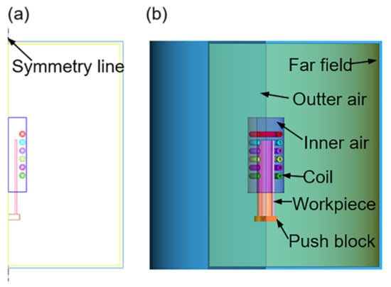 The working principle of the online super-frequency induction heating pilger rolling equipment developed in-house is illustrated in Figure 1. This study focused on the induction heating process. Therefore, only a finite element model of the induction heating part was provided, and the hot rolling model was omitted. To improve computational efficiency, the model was reasonably simplified and enclosed within a closed box, representing the far field. The spiral coil was simplified as a closed ring positioned alongside the tube blank. Since the coils are arranged parallel to the length of the tube and are coaxial with the tube blank, a two-dimensional model (Figure 2a) is selected by taking a cross-section, simplifying the original three-dimensional model for calculations. This simplification greatly enhances solution efficiency. The geometric models and the contact conditions of the models are shown in Figure 2b where the workpiece and coil are surrounded by inner air, inner air is surrounded by outer air, and outermost air is the far field. The contact was set to paste, and the initial temperature of all components was 20 °C. The magnetic insulation condition is applied in the far field; the edge condition of the contact between the workpiece and coil surface and the near-air field is continuous.