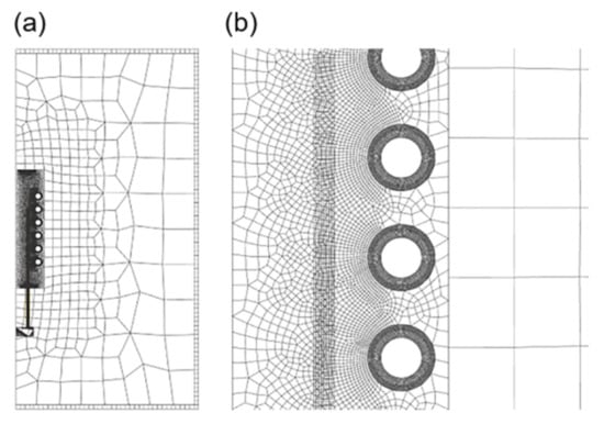 Grid dependence analysis reveals that, despite occupying the largest area, the outer air has the least impact and can be considered least important. The coil model, tube blank model, and the inner air surrounding the coil are critical factors influencing simulation results and should be prioritized in the modeling process. Grids should have a regular shape and smaller size to ensure accuracy. However, after a certain level of refinement, although the number of iterations increases significantly, the differences in temperature field display results become less pronounced. Therefore, the grid division presented in Figure 3 was employed. Figure 3a shows the overall situation, and Figure 3b shows the local amplification near the coil and the tube. The specific grid types and parameters are listed in Table 1.