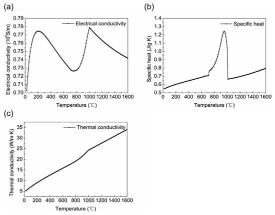 Physical properties of the material as a function of temperature: (a) electrical conductivity; (b) specific heat; (c) thermal conductivity.