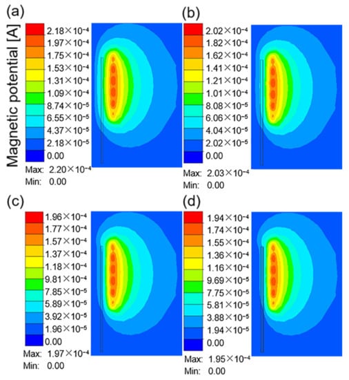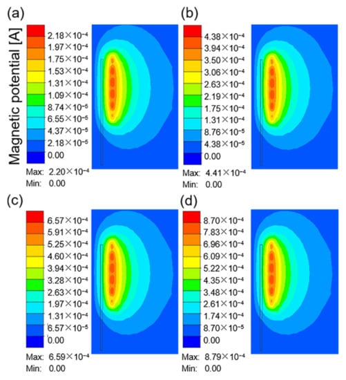 The magnetic potential around the coil at a current frequency of 10 kHz and different current values: (a) 100 A; (b) 200 A; (c) 300 A; (d) 400 A.