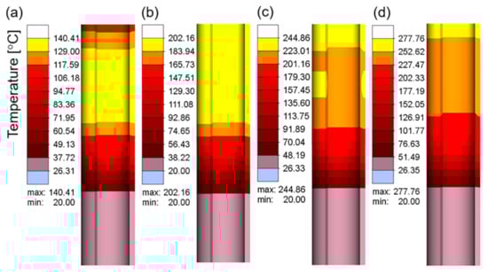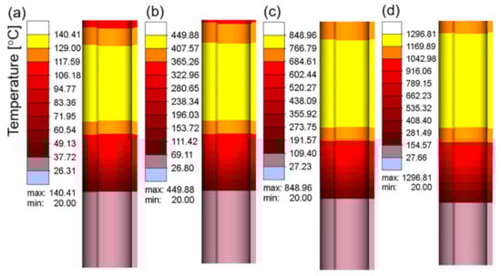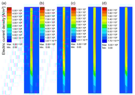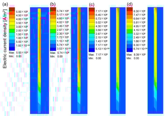 Figure 7a–d show the electric current density in the workpiece at different current values when the current frequency was 10 kHz. The electric current density represents the area in which the electrical current is concentrated. As shown in Figure 7, owing to the skin effect, the electrical current was mainly concentrated on the surface of the workpiece, and the inner current density gradually decreased. With an increase in the current value, the electrical current density increased continuously, which resulted in an increase in the heat flux and temperature in this region. Figure 8a–c and d show the temperature field corresponding to the different current values when the heating time was 15 s. The maximum heating temperature increased from 140.41 °C at 100 A to 1296.81 °C at 400 A. According to Joule–Lenz’s law, the Joule heat generated by the eddy current is proportional to the square of the current. The increase in the input alternating current causes the increase in the alternating magnetic field, which in turn causes the increase in the induced electromotive force of the metal conductor placed in the alternating magnetic field, thereby generating more Joule heat and causing the workpiece temperature to rise rapidly.