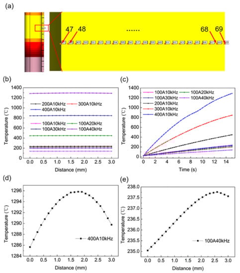 To understand the temperature difference in the workpiece along the thickness direction. The preset point temperature was recorded in the wall thickness direction, and the selected position of the point is shown in Figure 12a. Figure 12b shows the temperature of the selected point in the wall thickness direction under different current values and current frequencies when the heating time was 15 s. On a large scale, the temperature distribution in the wall thickness direction was almost linear. As shown in Figure 12d,e, after the scale was reduced, the temperature change exhibited a gradual increase from the interior to the exterior of the workpiece, and finally, a slight decrease near the outermost layer. The temperature reduction in the outermost layer may be related to heat dissipation from the workpiece to the air. Although there are some differences in the temperatures of the inner and outer layers, the temperature difference does not exceed 1%, indicating that the wall thickness direction achieved good heat permeability at current values of 100–400 A and current frequencies of 10–40 kHz. Figure 12c shows the temperature–time curve of point 69 at different current values and current frequencies. Under the same proportion of changes, the influence of the applied current on the rate of temperature increase was more obvious than that of the current frequency. The effect of current value and frequency value on workpiece temperature agrees with the results reported by L Lu et al. [36], while their research is concerned with the induction heating melting of titanium wire.
