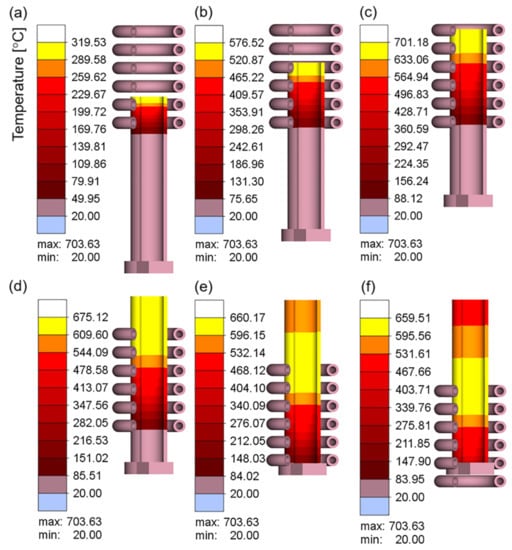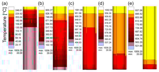 Figure 15a–e show the temperature cloud diagram of the workpiece at different feeding times at a current of 400 A and frequency of 30 kHz. The temperature of the workpiece did not decrease significantly during the entire feeding process, and the temperature of the workpiece became uniform as the workpiece was fed.