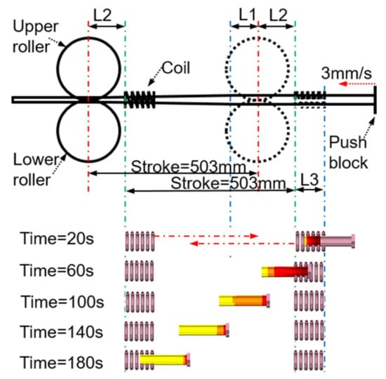 As shown in Figure 14, the distance from the beginning of the workpiece entering the coil to entering the roll was L1 + L2. Because the workpiece is accompanied by rotation during the feeding process, to achieve smooth rotation, the roll was not in contact with the workpiece at the rear limit position; that is, it does not immediately begin to deform after entering the roll but continues to move forward the L3 distance, and then the workpiece begins to roll. At this time, the feed distance was L1 + L2 + L3 = 85 + 120 + 90 = 295 mm, and it took approximately 95 s to feed at a rate of 3 mm/s.