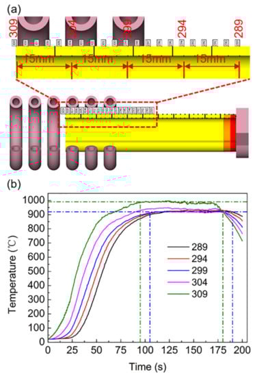 As shown in Figure 16b, with the exception of the temperature at points 309 and 304 at the top of the workpiece, which is slightly higher than that of the subsequent points, the temperature change trend of each point was similar, exhibiting a stable state after heating up to a certain temperature. When the workpiece was about to exceed the coil stroke, the temperature began to decrease. The reason for the slightly higher temperature at the top of the workpiece was identical to that when the coil was fixed, which was the edge effect. Point 299 can be used as a demarcation point for entering a stable heating state. This point represents the change rule of the subsequent points, and the maximum temperature was stable at approximately 925 °C. The heat transfer from the coil to the workpiece and the heat dissipation of the workpiece to the exterior reached equilibrium.