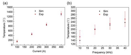 Simulation and experimental temperature at a heating time of 15 s: (a) f = 10 kHz, the temperature of the workpiece under various applied current values; (b) I = 100 A, the temperature of the workpiece under different current frequencies.