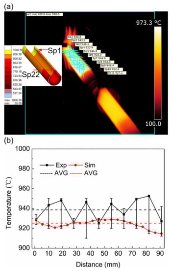 Figure 18a shows that when the superimposed motion was 140 s, the experimental and simulated temperature fields were compared. Based on the color, the temperature distribution of the workpiece in the length direction was uniform, and the temperature labels in the simulation and experiment were similar. Points in the length direction of the workpiece were selected, the temperature of the points was measured, and the temperature distribution of the workpiece in the length direction was plotted, as shown in Figure 18b. The total distance between the points was approximately 90 mm. The temperature distribution of the workpiece in the length direction was not significantly different, and the measured temperature fluctuation was slightly larger than the numerical simulation. The simulated temperature fluctuated at approximately 925 °C and the experimentally measured value fluctuated at approximately 938 °C; however, in general, the temperature difference was insignificant. The temperature difference between the two values was less than 20 °C, and the simulated values were consistent with the experimentally measured values. In plastic forming, temperature is a crucial parameter. The increase in temperature can soften the material, thereby reducing the forming force and making the metal easy to deform. Since this paper mainly focuses on the induction heating of an Ti6Al4V alloy tube, the subsequent hot pilger rolling deformation is not discussed. However, in the subsequent actual processing, we found that the deformation rate of the tube in the single-pass rolling deformation can reach 70%, which is much larger than the deformation rate of the cold rolling of 15%. This provides the possibility to replace the processing scheme of “multi-pass cold deformation plus multi-pass intermediate heat treatment”.