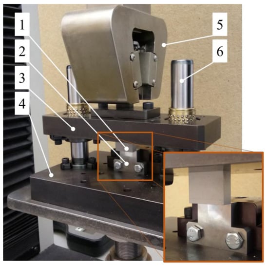 Testing station installed on testing machine: 1—cutting blade, 2—counter-blade, 3—movable upper plate, 4—fixed lower plate, 5—movable clamp of the testing machine, 6—guide with bearings.