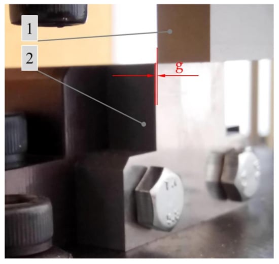 The testing station used in the test (see Figure 1) comprised two plates. The movable upper plate (3) was affixed to the movable clamp (5) of the testing machine. The plate (3) executed a reciprocating motion effected by the movement of the clamp (5) of the testing machine. The motion was carried out relative to the fixed lower plate (4) of the testing station thanks to two guides with bearings (6) affixed to the lower plate (4). The cutting knife (1) with a blade angle α = 0° and a rake angle β = 0° was affixed to the movable plate (3). The counter-blade (2) was affixed to the lower plate (4) (see Figure 1). The variable parameters in the first stage of the experimental study were: the offset g between the blade of the knife (1) and the counter-blade (2) was equal to g = 0.05, 0.1, and 0.2 mm (see Figure 2), and the blade velocity V was equal to V = 0.5, 1, 2, 4, and 8 mm/s. For each value of the offset g, the effects of all the blade velocity values V were examined. For each set of parameters, the test was repeated ten times.
