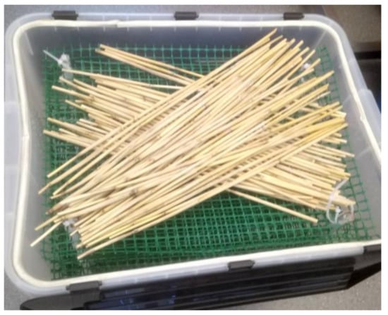 The testing was carried out for two levels of stem moisture content. As before, dry straw with a moisture content of 10% and moist straw was kept in special lockable containers to which warm water was introduced to evaporate and moisturize the straw (see Figure 3) in order to achieve the required level of moisture content. Approximately 1–2 L of hot water was poured into the bottom of the container, and the container was closed. The straw moisture was measured daily until it reached 40%.