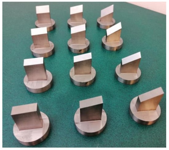 The second stage entailed examining the cutting process of the straw stem with different values of the blade angle, α = 0°, 15°, 30°, and 45°, blade rake angles β = 5°, 15°, and 30°, with the offset g = 0.1 mm, linear velocity of the blade equal to V = 8 mm/s, and moisture content in the straw stems of 10%, as the two latter parameters led to achieving the lowest values of the cutting force Fc in the first stage of the study. In summary, the 12 knives presented in Figure 4 were employed in the second stage of the examination.