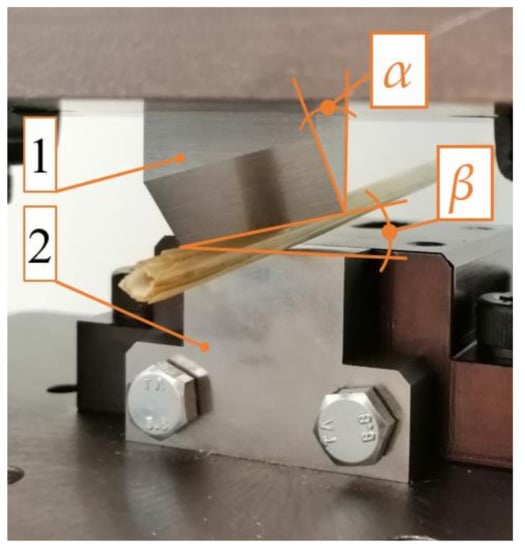 The testing station for the cutting process of straw stems utilized in the second stage of the study: 1—knife with blade angle α > 0° and β > 0°, 2—counter-blade.