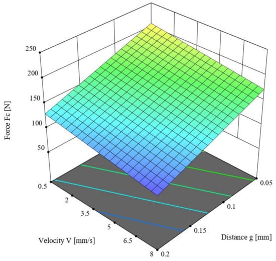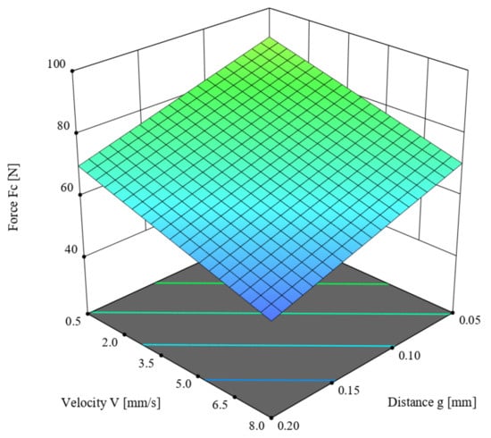 In analyzing the parameter values in Table 3, the offset g had a significant influence (p < 0.001) on the value of the cutting force Fc. A lower Fc value was achieved for an offset g = 0.2 mm and velocity V = 8 mm/s.