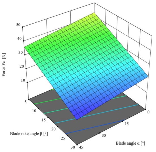 It follows from the analysis of the parameters in Table 7 that the only significant influence (which is why Table 7 only includes the rake angle β, and the lines of the surface graph are parallel to the axis of variance of the blade angle α, which further confirms that the variance of this angle value is not significant) on the value of the Fc″/Fc ratio is that of the blade rake angle β (p < 0.001), where the statistical F-value for this variable is F = 7772.22. The lowest value of the Fc″/Fc ratio was recorded for the entire range of values of the blade angle α and the angle β = 5°.