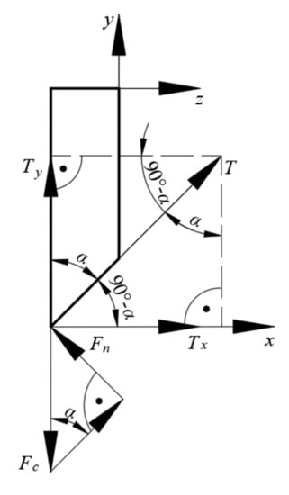 In analyzing the array of forces projected on the axis y (see Figure 13), the following dependence (8) can be obtained, indicating that the force Fc is a sum of the working force Fw and the vertical component Ty of the frictional force T: