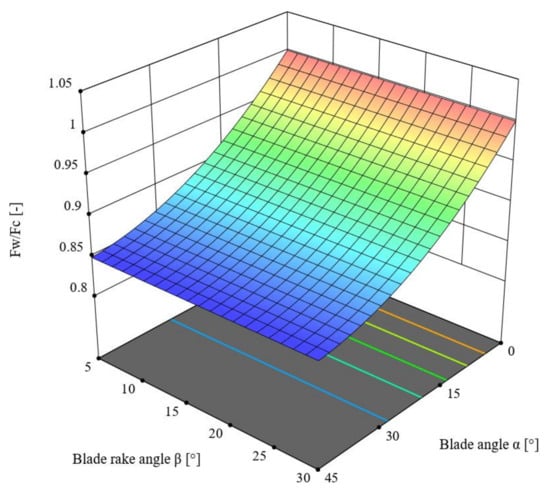 The analysis of the parameter values provided in Table 8 indicates that the value of the ratio Fw/Fc was significantly influenced by the blade angle α (p < 0.001), and the F-value for this variable was F = 10599.62. The lowest value of the Fw/Fc ratio was recorded for the angle value α = 45° as well as the entire range of values of the angle β.
