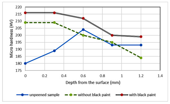 The initial residual stresses of the unpeened sample were +2.5 ± 8.5 MPa due to the effects of the manufacturing process and heat treatment. The irradiation of laser pulses on the sample with and without black paint created compressive residual stresses of −171.2 ± 8.0 MPa and −182.4 ± 7.2 MPa, respectively. The ablative layer induced 11.2 MPa more compressive residual stress on the surface, which is in agreement with the reports of Nikola. The ablative layer enhances the depth of residual stress [29]. The results show that the tensile stress in the material was converted into compressive residual stress. An imbalance was created between the permanent plastically deformed region and the elastically deformed regions beneath. This imbalance was the source of residual compressive stresses, which were confined to a thin layer. This compressive stress was balanced by the tensile residual stress extending beneath [30].