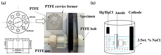 - Kim, S.H.; Lee, J.H.; Kim, J.G.; Kim, W.C. Effect of the Crevice Former on the Corrosion Behavior of 316L Stainless Steel in Chloride-Containing Synthetic Tap Water. Met. Mater. Int. 2018, 24, 516–524. [Google Scholar] [CrossRef]