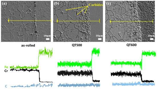 | (a) as-rolled (at%) | (b) QT500 (at%) | (c) QT600 (at%) | |