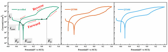 | QT500 | Quenching at 850 °C for 0.5 h and WC + tempering at 500 °C for 1 h and AC | |