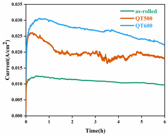 | QT600 | Quenching at 850 °C for 0.5 h and WC + tempering at 600 °C for 1 h and AC |