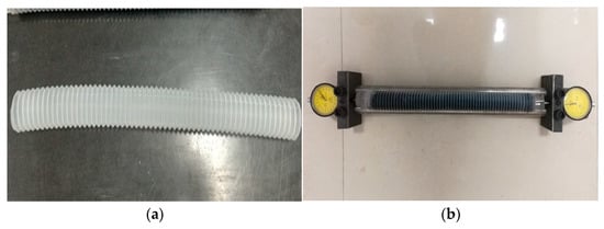 Figure 2. The molded test mold uses a corrugated tube made of polyethylene, and the inner diameter size of the corrugated tube is 33 mm. Each group of specimens consists of 3, and the shrinkage rate is the average of 3 specimens. After sealing both ends of the corrugated tube, it is horizontally fixed on the rack. The rack is composed of two parallel steel bars with a distance less than the diameter of the corrugated tube. After sealing and fixing both ends, it is in contact with the measuring head of the dial gauge, and the initial length of the specimen is measured after the alkali-activated slag cement has initially set. The reading of the dial gauge is recorded in real-time to obtain the specimen length change value. The shrinkage rate is calculated according to Formula (2):