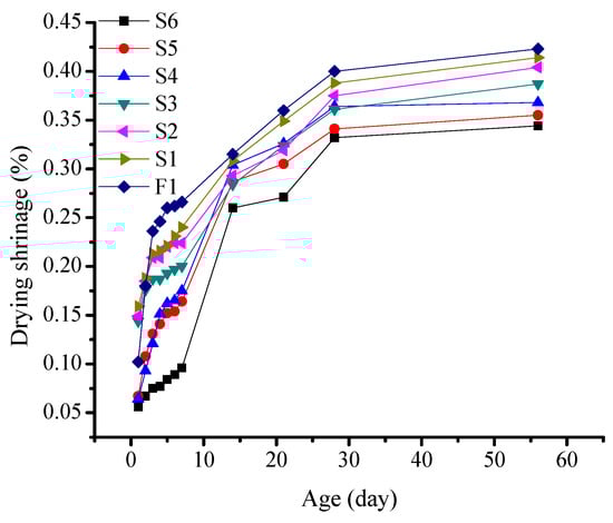 The drying shrinkage of all of the mortar specimens increased as the aging progressed. The shrinkage curves of the specimens are divided into three stages. From 1 to 7d, the specimens were maintained in the drying shrinkage curing box, wherein a rapid increase in the shrinkage rate was recorded. From 7 to 28d, the specimens continued to undergo shrinkage deformation, and the curve was less steep as compared to that before 7d. The upward trend gradually increased with an increase in age. At 28d, the shrinkage of the specimens was almost completed, and they entered a steady shrinkage-reduction stage. At 56d, the shrinkage rate stabilized and remained unchanged. By incorporating fine sand to partially replace the slag powder, the drying shrinkage of the mortar decreased at different ages. With an increase in the fine sand content, the reduction in shrinkage gradually increased. At the age of 7 days, it is evident that with the increase in fine sand content, the drying shrinkage of samples S1–S6 shows a decreasing trend. Among them, the S6 specimen with a fine sand content of 40% has the lowest drying shrinkage. At 28d, the difference in shrinkage between samples with different fine sand contents was further amplified. The shrinkage of the sample containing 40% fine sand was approximately 14% lower than that with 5%. At 56d, the volume of each sample stabilized and showed negligible changes.