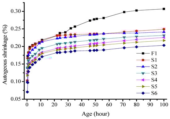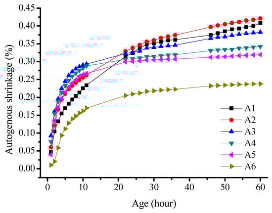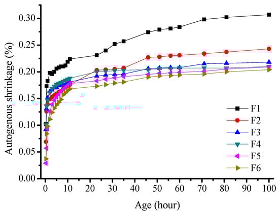 The deformation curve of the sample was divided into two stages, with distinct differences in the change rate of the autogenous shrinkage. The autogenous shrinkage of all the specimens increased with age, with rapid growth occurring within the first 10 h, and the growth rate plateaued after 60 h. In the first 10 h, the specimens with 80% fly ash content exhibited an autogenous shrinkage of 1618 × 10−6 mm/mm, which was 68% of that observed after 60 h. The autogenous shrinkage rate decreased with an increase in the fly ash content for over 60 h. Here, the autogenous shrinkage rate of the specimens with 80% fly ash content was 58% of that of the pure slag powder specimen with a similar cementitious system. When comparing the data of the systems with 80% and 100% slag powders, the shrinkage rate within the first 20 h was lower than that of the other groups. This may be due to the joint effects of chemical shrinkage and autogenous shrinkage caused by the hydration reaction of the samples, which consumes water from the internal pores.