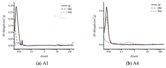 Figure 8a,b show the pore size distribution of alkali-activated slag materials containing 100% slag powder (A1) and 50% slag powder + 50% fly ash (A4) in the paste at 3d, 28d, and 90d, respectively.