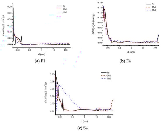 Figure 9a–c show the pore size distribution of alkali-activated slag materials containing 100% slag powder (F1), 50% slag powder + 50% fly ash (F4), and 80% slag powder + 20% fine sand (S4) in the mortar at 3d, 28d, and 90d, respectively. The pore structure characteristic parameters are listed in