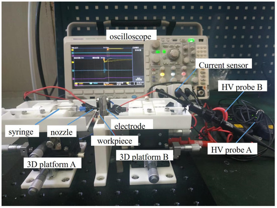 An experimental platform is established to apply the E-Jet discharge energy generation method into conventional micro EDM, as shown in Figure 1. This platform is primarily made up of four components: the E-Jet EDM component, the traditional EDM component, the current and voltage sensing component, and the workpiece. This workpiece is made up of two parts: the sacrificial one and the right one to be machined, which are joined together by a conductive block. The first E-Jet EDM section is on the left side of the workpiece and consists primarily of a syringe with a flat pipe-like spray nozzle filled with the electrolyte, as well as a 3D manual motion platform (A) used to adjust the position of the nozzle relative to the sacrificial work-piece. One terminal of the high-voltage DC power supply is connected to the syringe’s metallic needle. The conventional EDM section is on the right side and is nearly a mirror image of the first component. The only difference lies in that the syringe and flat-headed nozzle do not contain any electrolytes. Instead, a solid tungsten needle with a diameter of 0.3 mm is placed inside the nozzle, extending out as the solid electrode. By adjusting the 3D motion platform (B), the gap between the solid electrode and the workpiece can be regulated. On this side, the other end of the high-voltage DC power supply is connected to the solid tungsten needle. In the experiment, Spellman SL60 (Spellman High Voltage Electronics Corporation, Hauppauge, NY, USA) module is selected as the high-voltage DC power supply. The third sensing component, consists of two differential voltage probes and a current sensor. The current sensor (Tektronix current sensor TCP0030A, TEKTRONIX INC., Beaverton, OR, USA) measures the discharge current, and the voltage between the electrostatic field-induced jet and the sacrificial electrode, as well as the voltage between the solid electrode and the workpiece, is measured by two Tektronix high voltage differential probes (P6015A, TEKTRONIX INC., Beaverton, OR, USA). During the discharge process, the Tektronix oscilloscope (MDO3104, TEKTRONIX INC., Beaverton, OR, USA) is used to collect current and voltage signals online.