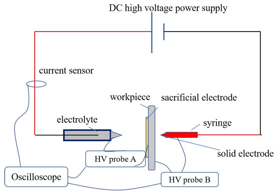 The schematic representation of the experimental apparatus is shown in Figure 2. The power supply is a high-voltage DC with a voltage range of 0–10 kV. It can generate a strong electric field, which drags the electrolyte jet from the flat-headed nozzle toward the sacrificial electrode without any pump [18]. With the electrolyte jet extending, the field intensity increases and results in the plasma breakdown. Due to the series connection, the discharges between the solid electrode and the workpiece and between the E-Jet and workpiece almost occur in the meantime. Materials are removed on both sides of the workpiece. Following the discharge, the surface tension can pull back the electrolyte jet towards the nozzle, leading to the discharge interruption and forming a pulse interval. As a result, periodic spontaneous discharges can occur.