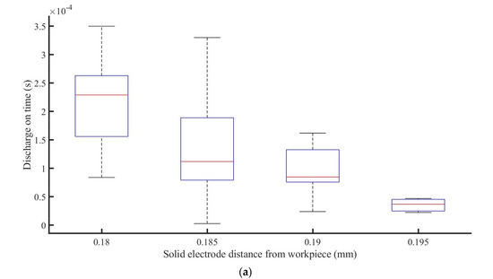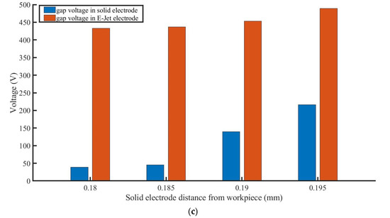 These might be caused by the reasons that in the discharge process, the capacity between the solid electrode and the workpiece can be treated as the feed capacity to that between the jet end and the sacrificial electrode, which in turn impacts the discharge between the solid electrode and workpiece. Changing the distance between the solid electrode and the workpiece entails changing the voltages between the jet end and the workpiece, as well as between the workpiece and the solid electrode. When the distance between the solid electrode and the workpiece is reduced, the capacitance between the solid electrode and the workpiece rises. Although the capacitance between the jet nozzle and the workpiece remains constant, the total capacitance between the jet nozzle and the solid electrode increases. At this stage, the strength of the electric field rises. The charge density on the cone surface increases as the electric field intensity increases, resulting in an increase in electrostatic repulsion forces at the cone tip, causing the cone angle to expand. In addition, the cone at the nozzle outlet begins to recede, resulting in a shorter cone. Meanwhile, the increased repulsive force causes the jet to expand in diameter. Heikkilä et al. [26] claimed that reducing the tip-to-collector distance can alter the form of the cone/jet in the nanofiber spinning process by the changes of the electric field. The electrolyte jet, on the other hand, can be regarded as a conductor in the E-Jet EDM process, allowing for discharge rather than continuous spinning. The higher the intensity charge density, the longer the discharge duration (Figure 6a) and the higher the current (Figure 6b). As the distance grows, the surface charge density falls gradually, the electrostatic repulsion on the cone’s surface lowers gradually, the cone’s length increases gradually, the cone angle decreases gradually, and the initial diameter of the jet decreases gradually. A drop in surface charge density and a small diameter of the jet result in a very short duration, and a minor charge depletion leads to a decrease in electric field forces and results in jet retraction. Because the interelectrode voltage is directly connected to the plasma characteristics during the discharge process, the greater the maintenance voltage, the larger plasma discharge gap [27]. Simultaneously, lowering the charge density and jet diameter decreases the strength of the discharge between the jet and the workpiece, causing the voltage to progressively rise as the electrode moves away from the workpiece, as shown in Figure 6c. Furthermore, when the discharge distance of the solid electrode jet electrode increases, the surface induced charge density of the two electrodes progressively decreases, which explains why the discharge energy reduces with increasing distance.