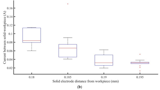 When the distance between the jet nozzle and the workpiece stayed constant, as illustrated in Figure 6a, the discharge duration time decreased with increasing distance between the solid electrode and the workpiece. The discharge current dropped as the distance between the electrodes increased, as illustrated in Figure 6b, ranging from 0.1 A at 0.18 mm to 0.04 A at 0.195 mm. The gap voltage between the solid electrode and the workpiece steadily grew at a low level throughout the discharge process while the gap was less than 0.185 mm, but it quickly increased from 0.185 to 0.19 mm, from dozens of volts to 230 V, as shown in Figure 6c.
