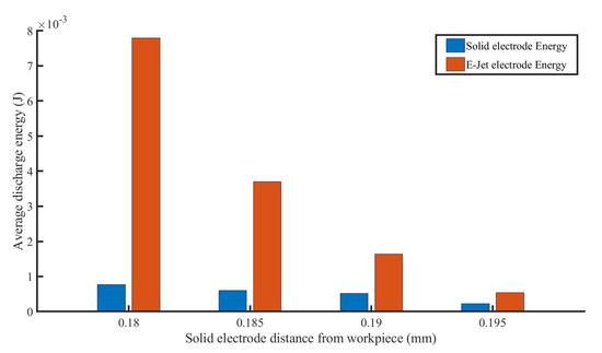 The discharge energy may be computed indirectly using Equation (2). The discharge energy between the solid electrode and the workpiece, as well as the discharge energy between the E-Jet and the workpiece, decreased steadily as the gap distance between the solid electrode and the workpiece increased, as shown in Figure 7. On the jet side, the discharge energy was always larger than that on the solid electrode side. The narrower the gap distance between the solid electrode and the workpiece, the bigger the discharge energy difference between the jet electrode side and the solid side.