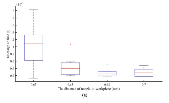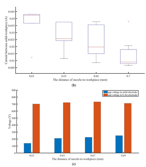 The graph in Figure 8a demonstrates that the duration of the jet discharge gradually reduced as the distance between the jet end and the workpiece surface rose, meaning that the discharge pulse width decreased as the distance increased. At the same time, as seen in Figure 8b, the discharge current steadily diminished. The voltages between the E-Jet nozzle and the workpiece gradually rose as the distance between the E-Jet nozzle and the workpiece grew, as illustrated in Figure 8c. The voltage on the solid side is much lower than the voltage on the E-Jet side.