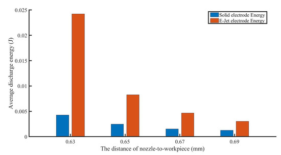 The discharge energy on these two sides may be estimated using Equation (1). It is revealed that the discharge energy on the E-Jet side reduces as the distance between the nozzle and the workpiece increases. Meanwhile, as seen in Figure 9, the discharge energy on the solid side declined extremely slowly.