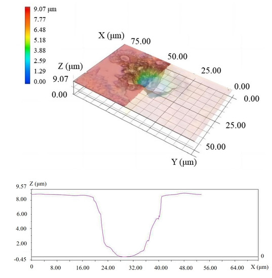 The distance between the nozzle that generates the E-Jet and the sacrificial workpiece during the discharge process was 0.62 mm, and the distance between the solid electrode and the workpiece was 0.18 mm. The applied voltage was 2.8 kV between the nozzle and the solid electrode. Table 1 lists the machining parameters. After 1 min of processing, a point feature on the workpiece surface could be found by the naked eye. The cave could be observed through a microscope (VHX-6000 microscope, KEYENCE CORPORATION, Osaka, Japan) after being ultrasonically cleaned for 20 min and dried, as shown in Figure 10. It was discovered that a pit with a diameter of 20 μm and a depth of 9 μm could be machined. On the bottom of the pit, it was possible to see a discharge erosion phenomenon. This demonstrates that the energy generation method can be used in the solid electrode discharge process and that the materials can be removed. At the same time, the pit’s shape differed a little from that of the cylindrical solid electrode with a tip in conventional EDM. This is primarily due to the fact that the solid electrode did not rotate, and the gap distance reached 0.18 mm, which is significantly greater than that in traditional EDM in gas observed by Wang and Shen [29]. Furthermore, due to the large gap, plasma drift occurred during discharges, resulting in the irregular shape of the machined pit [30].