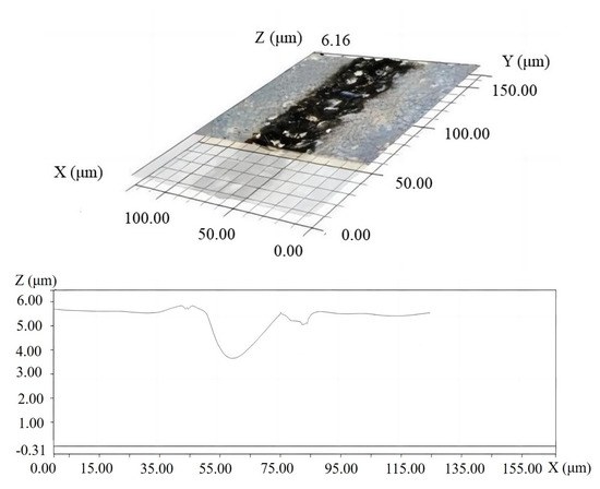 The machining parameters, solid electrodes, and workpieces used in the groove machining experiment were the same as that in previous pit etching process. The discharge gap between the jet electrode and the sacrificial workpiece remained constant, as did the gap between the solid electrode and the workpiece. The only difference was that the manual platform (B) under the solid electrode was slowly moved in the horizontal plane, and perpendicular to the electrode direction, to test the method’s continuous groove processing feasibility. Figure 11 depicts the finished groove observed by VHX-6000 microscope. It was discovered that a regular groove with a depth of 4μm and a width of 30 μm could be processed. Although the width of the groove was fairly uniform, it was still significantly larger than the diameter of the solid electrode. This is primarily due to the plasma deflecting in a wider gap in the gas.