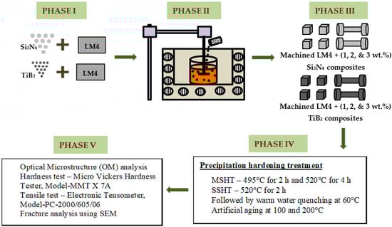 Figure 1 illustrates the detailed approach used in the current study, which is divided into five phases. Phase I—Materials and their properties, Phase II—Two-stage stir casting procedure, Phase III—Preparation of cast samples for further analysis, Phase IV—Precipitation hardening treatment, Phase V—Morphological analysis (using an optical microscope (OM) and a scanning electron microscope (SEM)) and mechanical property testing (hardness and tensile).