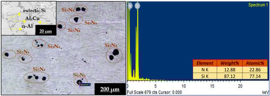 Mohanavel et al. [13] fabricated AA7178 + Si3N4 composites using the stir casting method, and the results confirmed that the addition of Si3N4 caused grain alteration of Al, which was the key cause for its mechanical property enhancement. Adding Si3N4 reinforcements to the Al matrix resulted in an increment of mechanical properties of the fabricated composites; preheating of the Si3N4 improved its wettability with the Al matrix [14,15,16]. This inclusion of reinforcements improved the heat treatability of the base alloy by accelerating the aging kinetics and allowing secondary hardening due to intermetallic precipitation. Zhigang et al. [17] examined the aging behavior of Al6061 + Si3N4 composites. From the outcomes, the authors concluded that after solutionizing, modification in grain structure was not observed, whereas after aging ß″, intermetallic phase was observed, which resulted in improvement of mechanical properties. Additionally, an acceleration in aging kinetics was observed after addition of Si3N4 reinforcement. Xiu et al. [18] developed Al-Si3N4 composites with the pressure infiltration method, and the authors concluded that the properties of fabricated composites could be enhanced by subjecting them to T6 HT. As per Wang et al. [19], to dissolve Mg2Si and to modify eutectic Si into spherical form, Al-Si must be solutionized at 540 °C. Additionally, during aging, the inclusion of any foreign particles (reinforcements) acted as obstacles to the movement of dislocation during mechanical testing. It provided better mechanical properties to the treated composites. Akhil et al. [20] performed a precipitation hardening treatment on Al-Si alloy and concluded that when solutionized at 500 °C, spheroidization of eutectic Si was noticed, and artificial aging resulted in increments of mechanical properties of the alloy. The major goal of solution heat treatment (SHT) [21] and its importance in improving the mechanical properties were studied by Han et al. [1]. Precipitation hardening on Al alloys was performed by many researchers [22,23,24]. It was concluded that this process helped Al-Si alloy in attaining better mechanical properties.