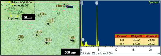 Figure 2 and Figure 3 depict OM images (with different magnifications) and EDS analysis of L3SN and L3TB heat-treated (peak-aged) composite samples. From Figure 2, we can see that the reinforcement distribution is homogeneous throughout the matrix, and proper bonding can be observed with almost zero porosity. Here, dark spots are identified as Si3N4 reinforcement particles, and the EDS report also confirms the presence of Si and N peaks of spectrum 1 (spot analysis). At some places, small dark spots are observed, identified as small reinforcement powder fragments. This proper distribution of reinforcement indicates that the two-stage stir casting method can be effectively used in the preparation of the composites. The magnified image of L3SN in Figure 2 shows the presence of eutectic Si (circular shape), which indicates that the addition of Si3N4 as reinforcement caused a modification in eutectic Si; also the formation of Al2Cu (copper aluminide) light and blocky phase is observed [35], which is the main reason in attaining peak hardness after precipitation hardening treatment. Similarly, from Figure 3, we can see that the distribution of TiB2 within the matrix is uniform, and no porosity is observed; also, the EDS report confirms the peaks of Ti and B of spectrum 1 (spot analysis). From the magnified image of L3TB in Figure 3, we can observe the better modification of eutectic Si when compared to L3SN; also, the addition of TiB2 causes more Al grain refinement, and more nucleation sites are formed during HT process. Along with Al2Cu, the Q-Al5Mg8Cu2Si6 phase also precipitated here, with a long needle shape rather than the uneven form seen in the LM4 microstructures; also, some remnants of Al2Cu are observed [23]. The presence of these two phases helped TiB2 composites achieve better mechanical properties compared to Si3N4 composites. From the microstructures, it can be confirmed that there is no slag nor porosity, which indicates the soundness of the two-stage stir casting method. Formation of metastable intermetallic phases (Al2Cu, Q, and Mg2Si) is validated by XRD analysis from prior research [26,27,36], which are also in line with the literature.