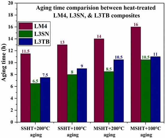 Cast composite samples were subjected to a precipitation hardening treatment. This was carried out in two stages. In stage 1, one set of samples from both the composites was subjected to MSHT, followed by water quenching at 60 °C to reduce the internal stresses. Then, the samples were treated for artificial aging at 100 and 200 °C. Samples were taken out every 30 min, quenched in water at room temperature, and a hardness test was carried out until peak hardness was achieved. Similarly, in stage 2, separate samples from both composites were subjected to SSHT, followed by quenching and artificial aging at 100 and 200 °C until peak hardness was achieved.