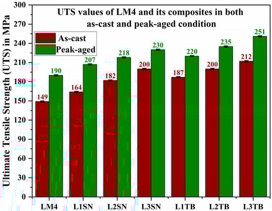 Figure 6 shows UTS values of LM4 and its composites in AC and peak-aged conditions. Composites displayed better UTS values than LM4. The addition of reinforcements caused the formation of dislocation pile-up, and the presence of these hard reinforcement particles obstructed dislocation motion and absorbed most of the stress during testing, with an increase in wt.% UTS values improved in both the composites. TiB2 composites have the highest UTS compared with Si3N4 composites, the explanation of which is similar to that of hardness values. Table 3 shows the load vs. displacement values of AC and peak-aged LM4, L3TB, and L3SN samples. We can notice that peak-aged L3TB could bare more load till 8110 N before breakage than any other sample. These values justify the UTS values shown in Figure 6.