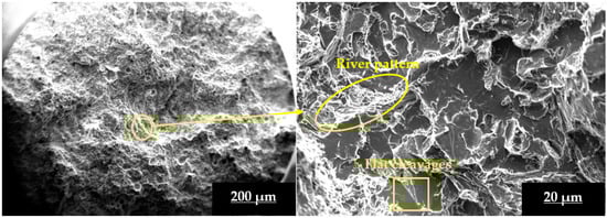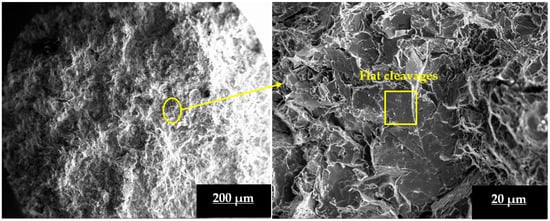 Fracture analysis of LM4 in both AC and peak-aged conditions was performed in our earlier studies [26]; from SEM images, it was understood that in AC condition, the LM4 sample experienced ductile failure, whereas in peak-aged condition (MSHT + 100 °C aging), samples experienced a mixed mode of failure (both ductile and brittle) because it had displayed a better UTS value than AC LM4. The fracture analysis of peak-aged L3TB and L3SN is performed in this study, and the SEM images of the same are given in Figure 7 and Figure 8, respectively. The existence of flat cleavages can be observed from the magnified SEM image of Figure 7, indicating brittle fracture. Furthermore, fine dimples are observed, which might have transitioned from coarse to fine during HT, indicating brittle fracture. In the instance of LM4, the dimple density was higher, but there were also micro-voids and some river patterns, indicating that the sample had undergone ductile failure. One of the key causes for the brittle mode of fracture and the highest UTS value in peak-aged L3TB sample is due to the existence of hard reinforcements and the formation of metastable intermetallic phases during HT [40].